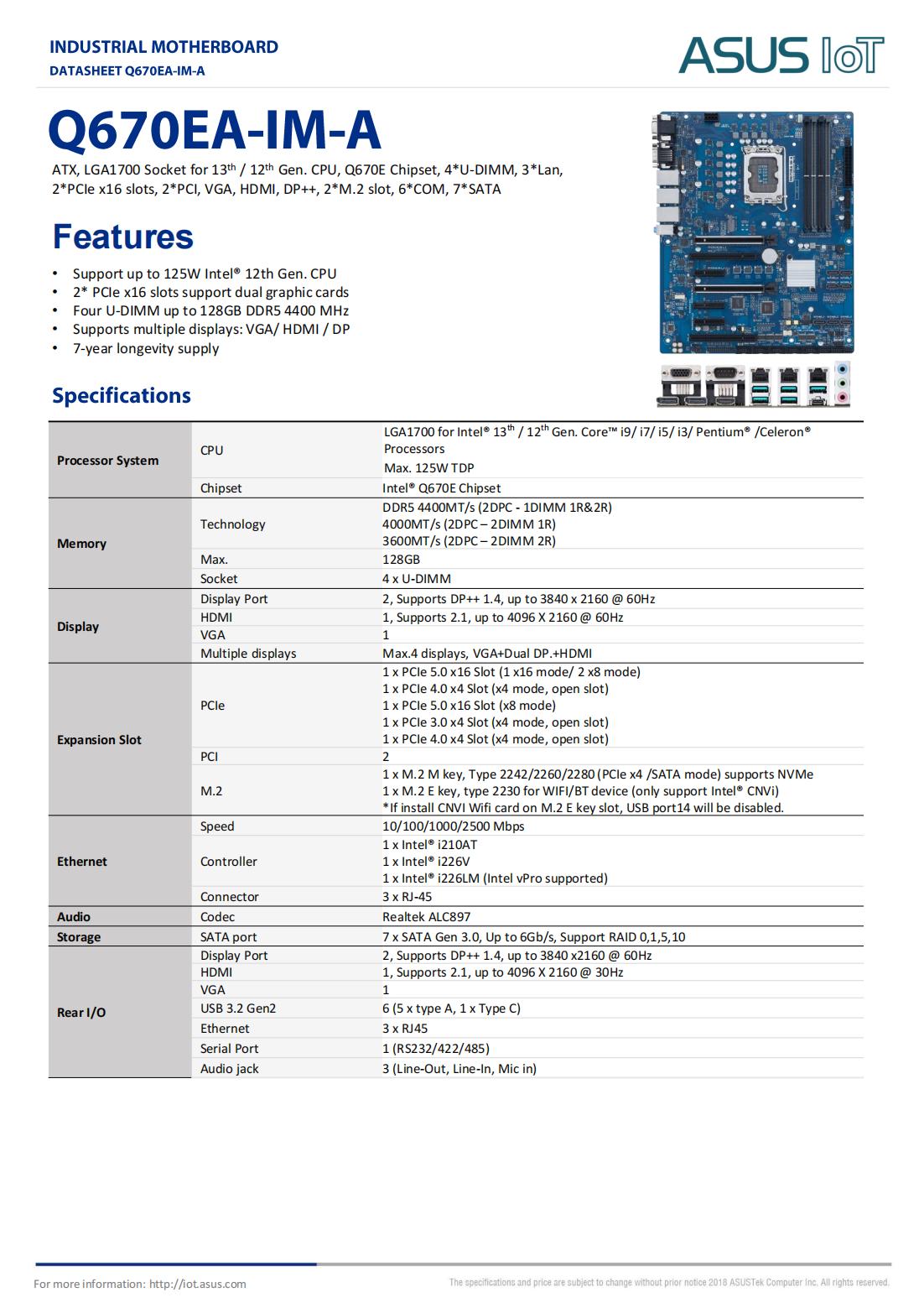 ATX, LGA1700 Socket for 13th / 12th Gen. CPU, Q670E Chipset, 4*U-DIMM, 3*Lan,