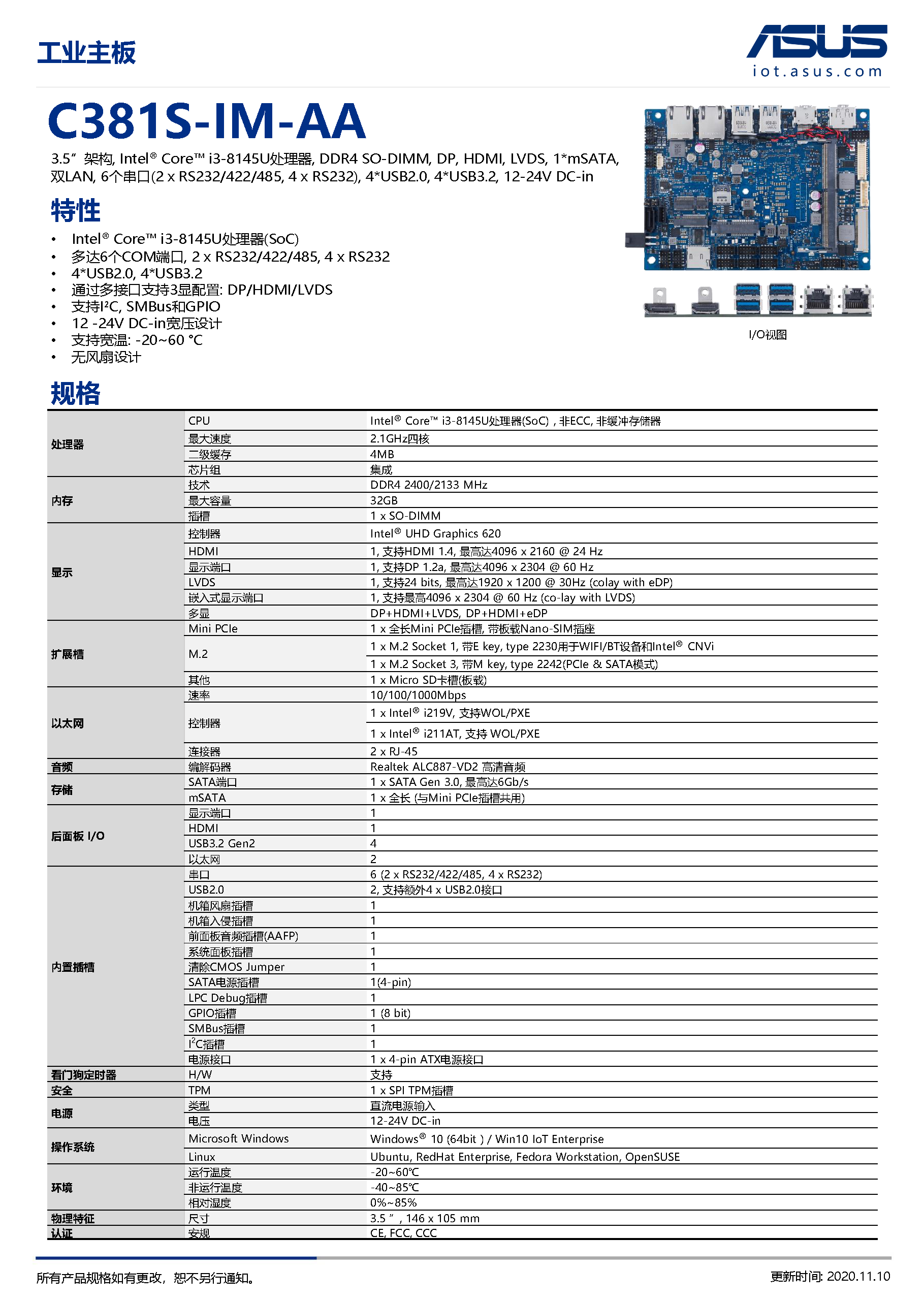 3.5”架構(gòu), Intel? Core? i3-8145U處理器, DDR4 SO-DIMM, DP, HDMI, LVDS, 1*mSATA, LAN, 6個(gè)串口(2 x RS232/422/485, 4 x RS232), 4*USB2.0, 4*USB3.2, 12-24V DC-in