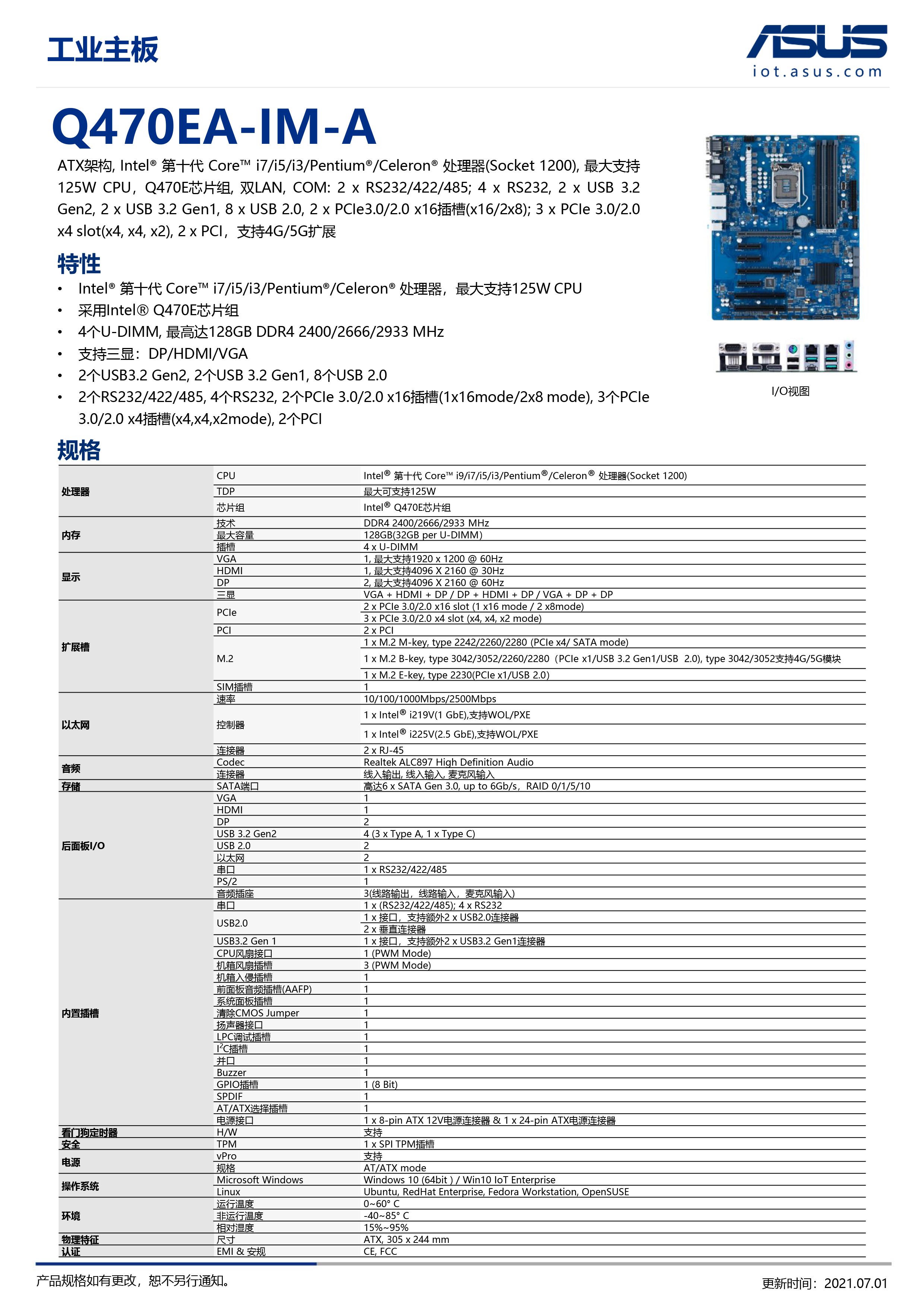 125W CPU,Q470E芯片組, 雙LAN, COM: 2 x RS232/422/485; 4 x RS232, 2 x USB 3.2